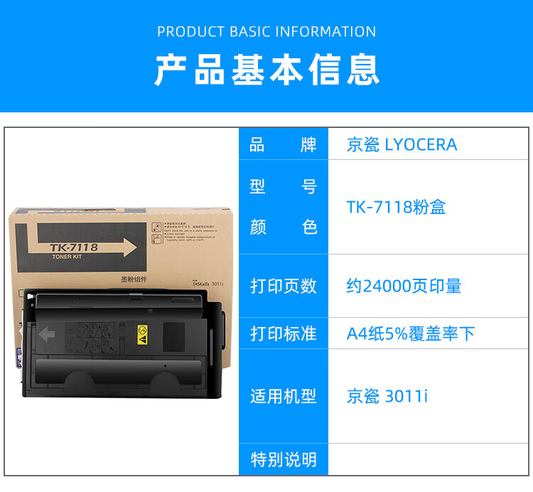 京瓷原装京瓷TK-7118粉盒墨粉碳粉3011i墨粉复印机黑色碳粉约24000页 自营